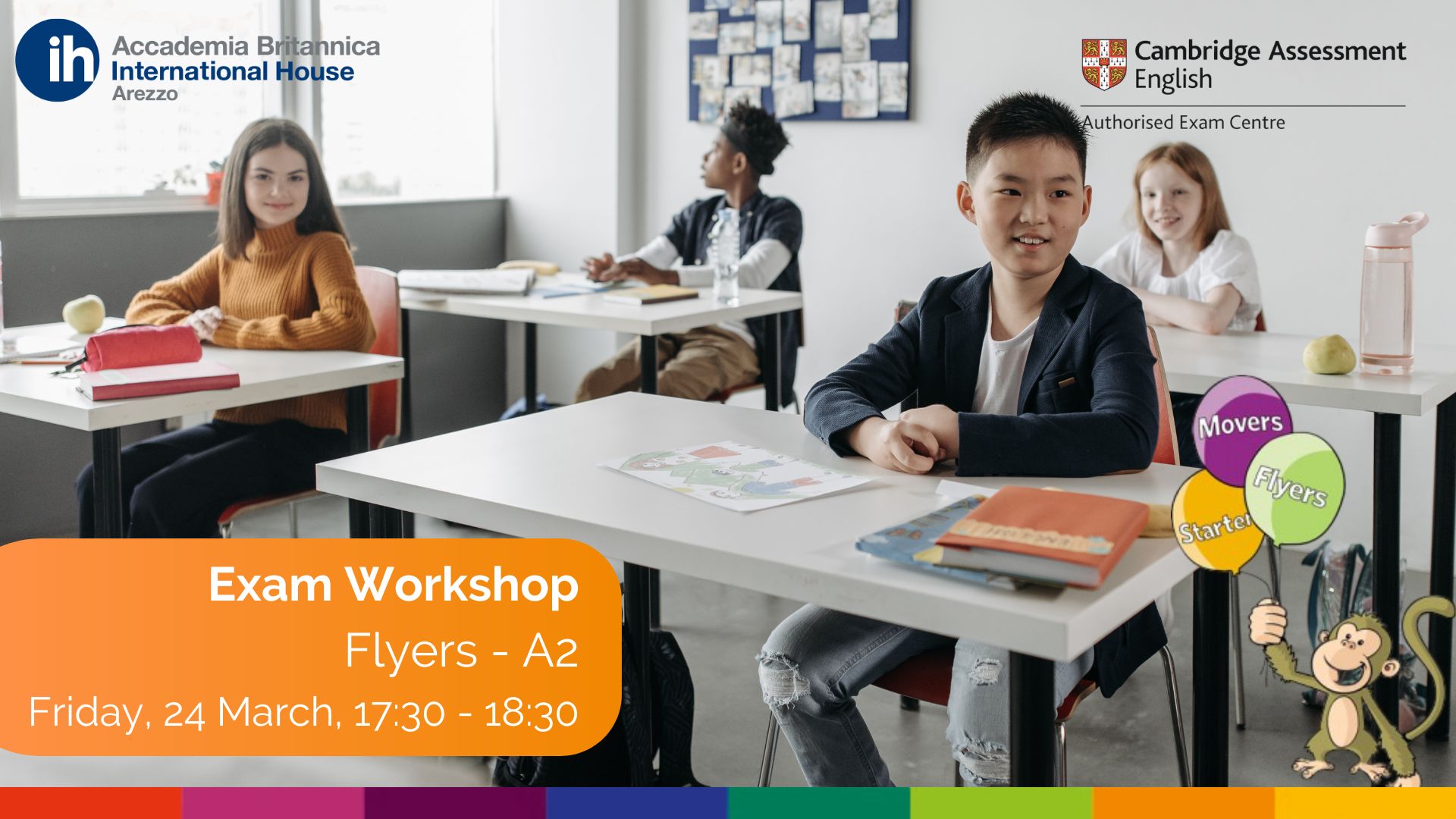 Tutti i bambini nei corsi di Flyers e i corsi individuali/semi/tris al livello predetto sono invitati al nostro Flyers Exam Workshop per prepararsi per l’esame.